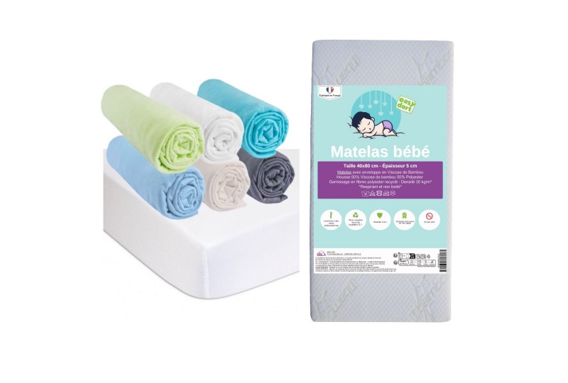 Matelas 40x80 + 6 Draps housse Coton OCÉAN + 2 Protèges-matelas
