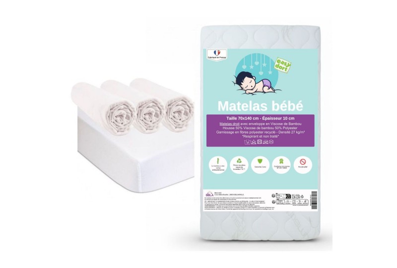 Ce kit comprend un matelas 70x140 cm, trois draps housses en coton bio blanc et deux alèses bio, offrant une solution complète pour le lit de votre bébé. Les alèses assurent une protection optimale du matelas contre les accidents et les fuites, vous permettant d'avoir toujours une alèse propre à portée de main. Les draps housses en coton bio sont doux, faciles à entretenir, et offrent un ajustement parfait sur le matelas. Vous n'aurez plus à vous soucier de la préparation du lit de votre bébé, car tout ce dont vous avez besoin se trouve dans ce kit pratique.