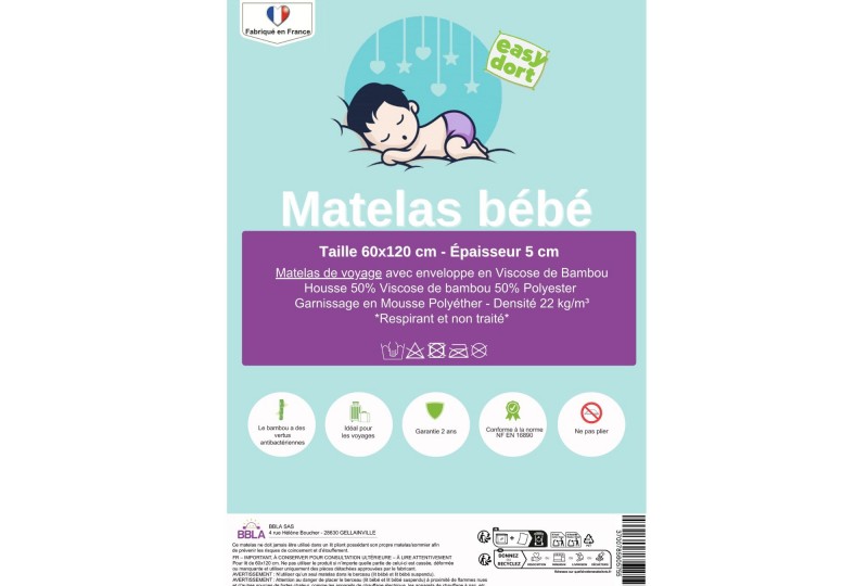 Made in France, ce matelas de voyage bébé 60x120 cm est un produit iconique d'Easy Dort. Il est très pratique et confortable, facile à transporter. Fabriqué en France, ce Matelas Nomade 60x120 assure le confort de vos voyages et la sécurité de votre bébé pendant ses nuits.