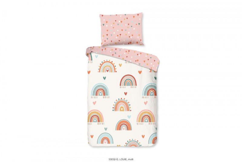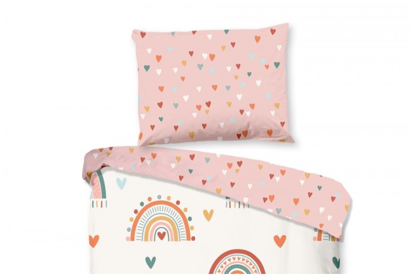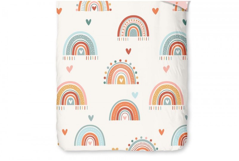 Une jolie parure de lit 120x150 cm aux motifs arc-en-ciel et petits cœurs pour décorer la chambre de bébé fille.